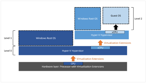 - Hyper-V VM(가상 머신) 내에서, Hyper-V 혹은 타사 Hypervisor와 같이 가상화를 실행할 수 있는 기능