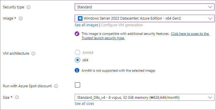 VM 생성 시에 Security Type을 ' Trusted launch virtual machines (default)'를 'Standard'로 변경 필요