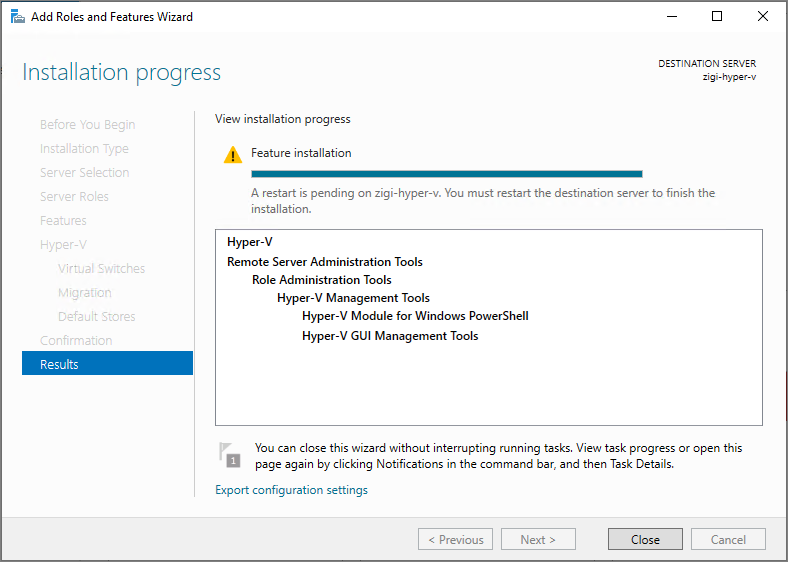 모든 Hyper-V 기능 설치가 완료된 이후에, 서버 재부팅합니다.