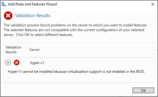 중첩 가상화를 위한 Intel VT-x 나 AMD-V의 기능이 활성화 되지 않았기 때문입니다.