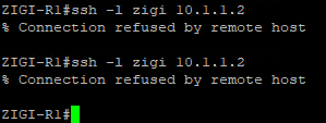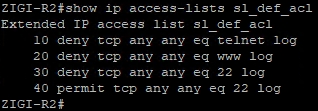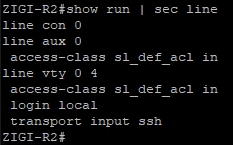 ZIGI-R2 장비의 line설정 에는 별도의 ACL 없이 SSH 접근이 허용되도록 설정되어 있습니다.