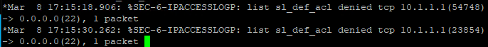 자동으로 설정된 ACL의 설정의 log로 인해서 다음과 같이 차단 로그가 뜨는 것을 확인 할 수 있습니다.
