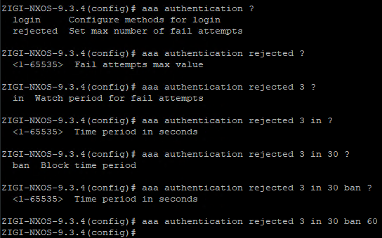 - aaa authentication rejected 명령어는 지정된 시간 동안 로그인 시도를 차단하는 기능