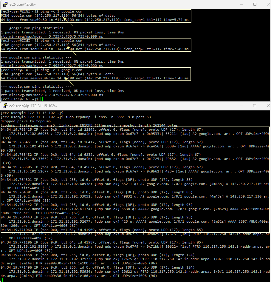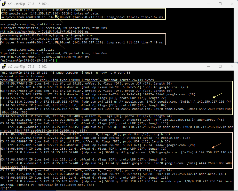 - google.com 으로 ping을 보내면서, DNS query에 대한 패킷을 tcpdump로 확인해보면,