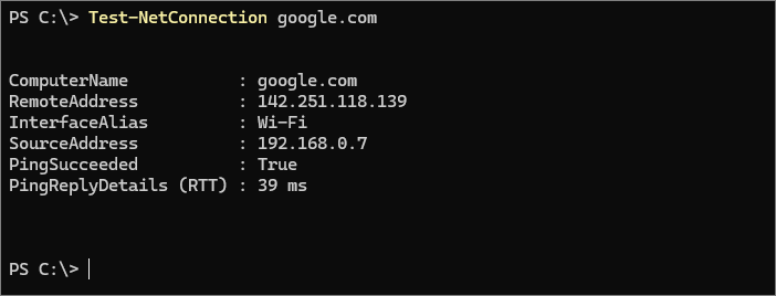 Test-NetConnection은 연결(Connection)에 대한 진단 정보를 확인할 수 있는 PowerShell 명령어로 다음의 기능을 수행할 수 있습니다.