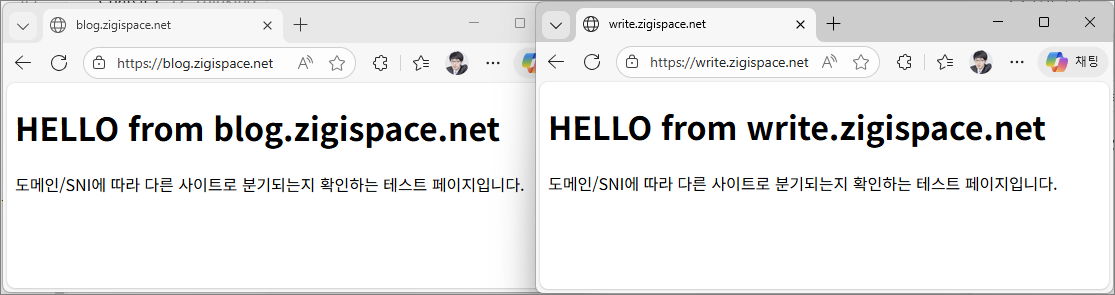 이번 포스팅에서는 blog..zigi.space / write.zigi.space 두 도메인을 같은 서버의 Public IPv4에 붙여 놓고, SNI가 도메인별로 다른 인증서를 선택하게 만드는지를 확인합니다.