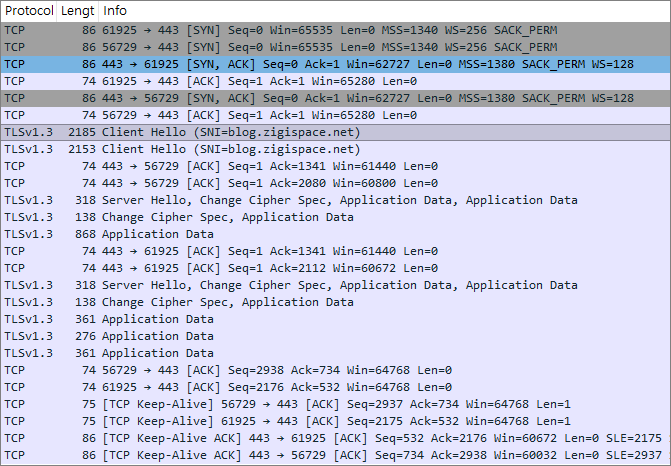 3way handshake 이후에, TLS v1.3 Client Hello로 SNI 값으로 도메인 정보를 전송하게 되고,