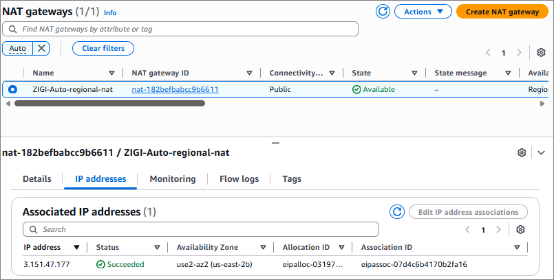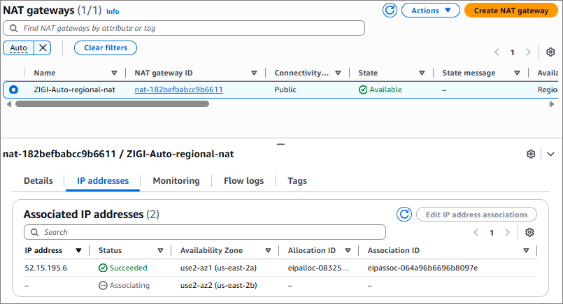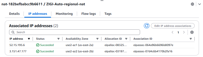 - 신규 가용영역으로 NAT Gateway 확장이 모두 완료되면, 아래와 같이 Status가 Succeeded 된 것을 볼 수 있음.