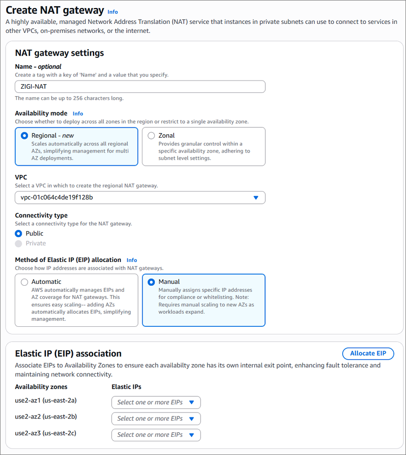 - Manual 방식 구성 시에, 각 가용 영역 별로 EIP 수동으로 지정 가능