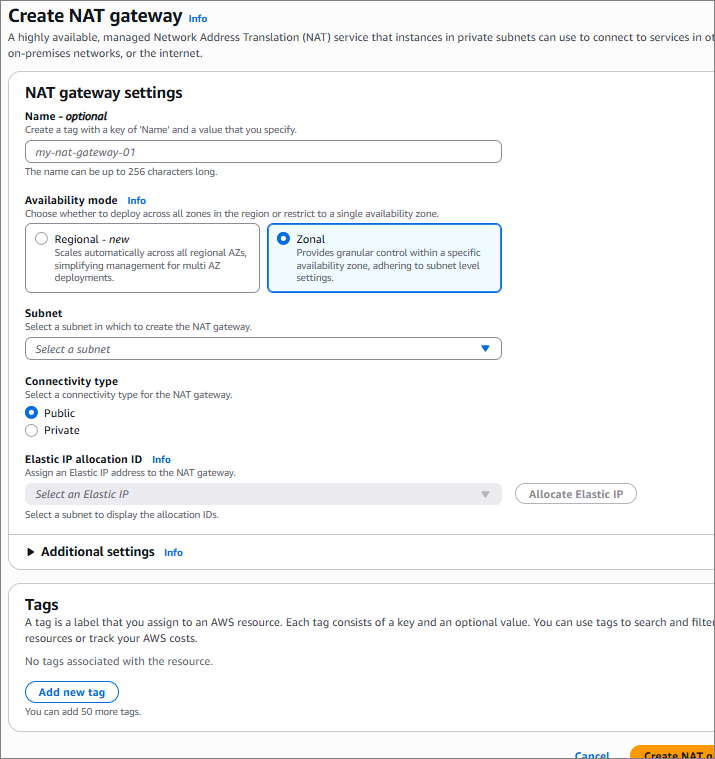 - Zonal NAT Gateway도 사용이 가능하며, 이 경우에는 VPC가 아닌 Subnet을 선택하게 되어 있음(기존 방식)