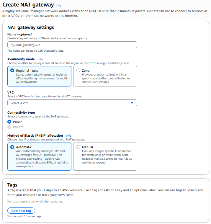 - AWS Console에서 NAT Gateway 생성 시에, 아래와 같이 Availability mode가 추가 된 것을 볼 수 있음.