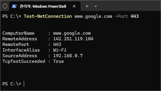 여기서 확인 할 내용은 'TcpTestSucceeded'가 'True'인지, 'False' 인지를 확인하는 것입니다.