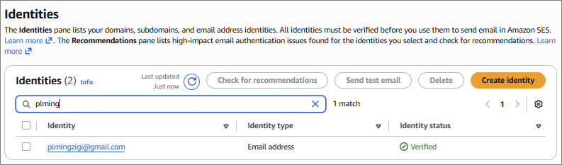 이제 다시 Amazon SES에 생성한 Email 주소 Identity를 보면, 'Verfied' 상태가 된 것을 볼 수 있습니다.