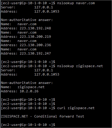 - 아래 결과를 보면, 'zigispace.net'의 경우, 지정한 dns인 10.2.0.61 / 10.2.0.73으로 forward되어서, 결과를 받아오는 것을 볼 수 있습니다.