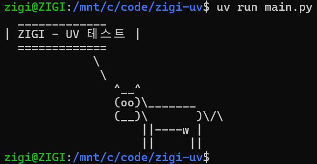 위와 같이 소 모양의 아스키 아트와 함께 메시지가 출력된다면, uv를 통한 패키지 격리 및 실행 환경 구성이 정상적으로 완료된 것입니다.