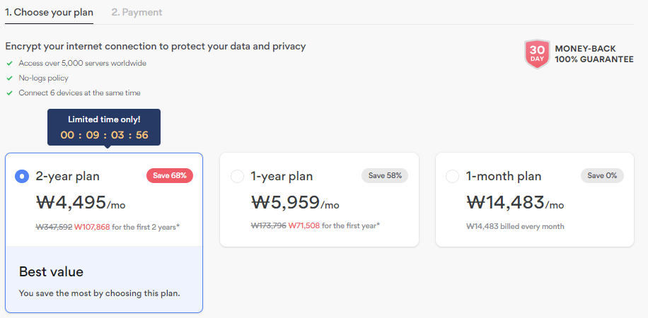 First, decide on your pricing policy (plan). The longer the subscription period, the greater the discount rate, so it is recommended to take a longer period if you plan to use it continuously. 100% refund is possible for 30 days, so there is no need to use a monthly plan instead of a long-term subscription. If you sign up for a long-erm, and if you don't like it, you can get a refund within 30 days.