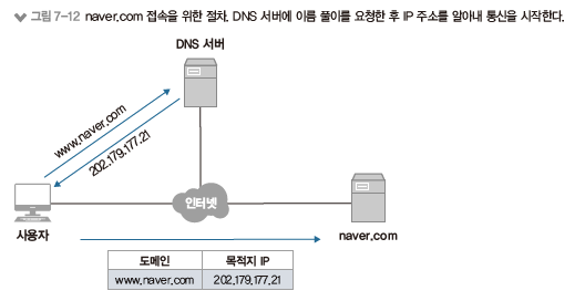 사이트에 접속하거나 링크에 지정된 주소는 http://202.179.177.21 같은 IP 주소이거나 https://www.naver.com 같은 도메인 주소를 사용하게 됩니다. 물론 어떤 주소를 사용하더라도 실제 네트워크 통신에서는 202.179.177.21 같은 IP 주소를 이용합니다. 하지만 사용자가 수많은 IP 주소를 외우기는 어렵습니다. 보통 한 번에 외울 수 있는 숫자는 7~8자리인데 IP 주소는 최대 12자리로 구성됩니다. 접속하는 사이트마다 긴 IP 주소를 모두 기억해야 한다면 인터넷 서핑이 괴로워