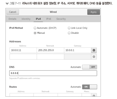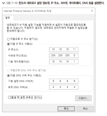 물론 서비스를 도메인 주소를 사용하더라도 실제로 패킷을 만들어 통신하려면 3계층 IP 주소를 알아야 하고 이를 위해 문자열로 된 도메인 주소를 실제 통신에 필요한 IP 주소로 변환하는 DNS(Domain Name Server) 정보를 그림 7-10과 그림 7-11처럼 네트워크 설정 정보에 입력해야 합니다.