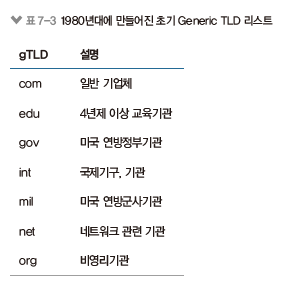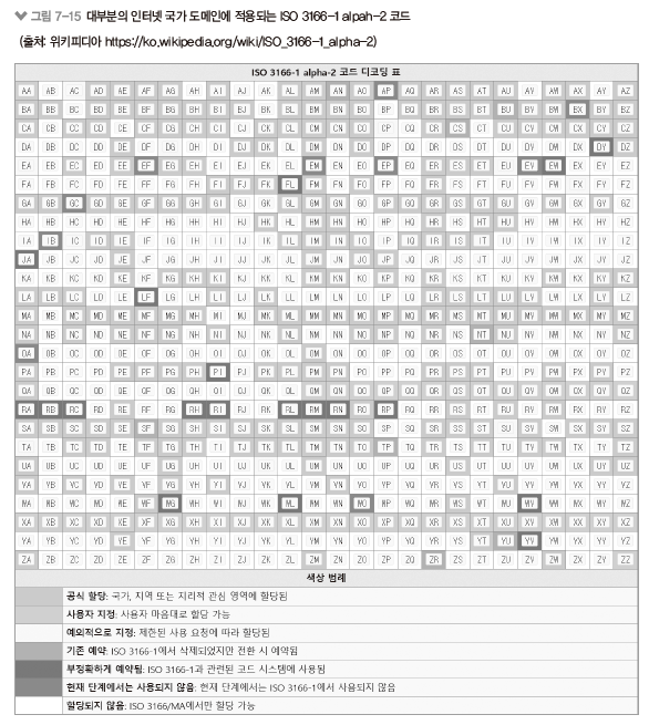 에는 gTLD에서 구분한 것처럼 사이트 용도에 따른 코드를 사용합니다. 예를 들어 일반 회사는 co.kr을 사용하고, 정부기관은 go.kr을 사용하는 방법입니다. 우리나라는 gTLD를 두 글자로 줄여 사용하지만 호주나 대만처럼 gTLD를 그대로 사용하는 나라도 있습니다.(com.au, gov.au, com.tw, gov.tw 등) 영국은 ISO 3166 표준이 아닌 uk라는 별도 ccTLD를 사용합니다. 그림 7-15는 ccTLD에 대한 표준 코드표입니다. 이처럼 다양한 국가별 코드가 정의되어 사용된다는 것을 알 수 있습니다. 할당에 대한 세부 구분은 그림에 있는 위키피디아 링크를 참고하면 확인할 수 있습니다.
