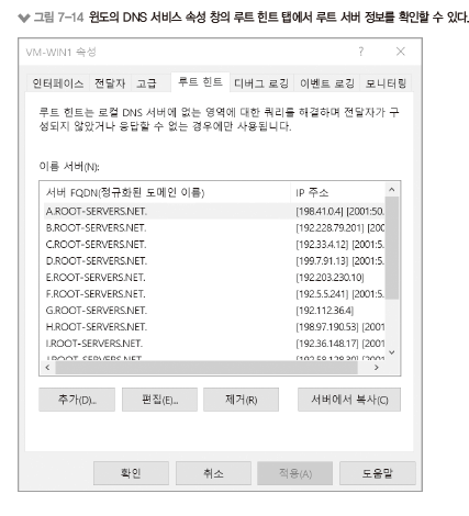 윈도 서버에 DNS 서비스를 활성화하면 DNS 서비스에 기본으로 저장되어 있는 루트 서버 리스트 정보를 확인할 수 있습니다.