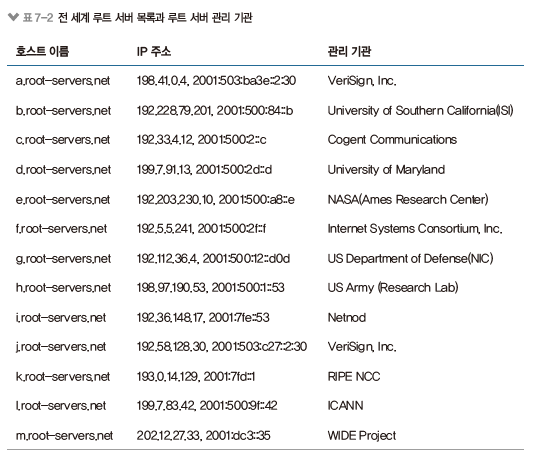 루트 도메인은 앞에서 말했듯이 도메인을 구성하는 최상위 영역입니다. DNS 서버는 사용자가 쿼리한 도메인에 대한 값을 직접 갖고 있거나 캐시에 저장된 정보를 이용해 응답합니다. 만약 DNS 서버에 해당 도메인의 정보가 없으면 루트 도메인을 관리하는 루트 DNS에 쿼리하게 됩니다. 루트 DNS는 전 세계에 13개가 있고 DNS 서버를 설치하면 루트 DNS의 IP 주소를 기록한 힌트 (Hint) 파일을 가지고 있어 루트 DNS 관련 정보를 별도로 설정할 필요가 없습니다.