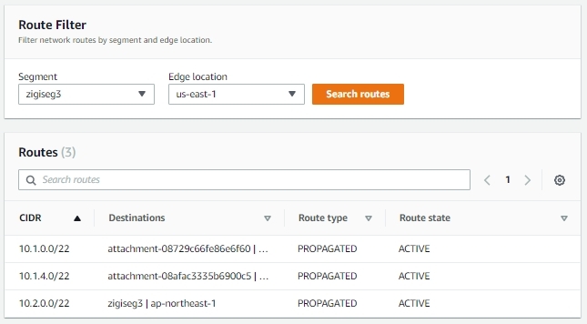 zigiseg3의 경우, 다시 zigiseg1에 속한 Attachment(10.1.0.0/22)에 대한 라우팅이 테이블에 반영된 것을 볼 수 있습니다.