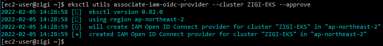 | $ eksctl utils associate-iam-oidc-provider --cluster ZIGI-EKS --approve |