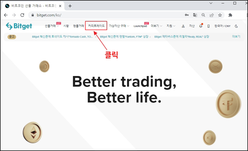 먼저, 비트겟 카피트레이딩을 위해서 '카피트레이드' 메뉴로 들어갑니다.