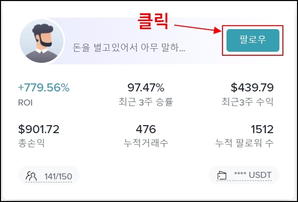 선택한 트레이더의 오른쪽의 '팔로우' 버튼을 클릭합니다.