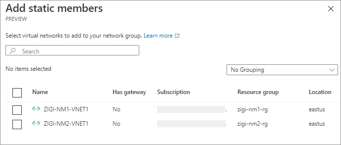 2개의 VNet 중에 'ZIGI-NM1-VNET1'만 선택하여, Network Group에 추가한 후에