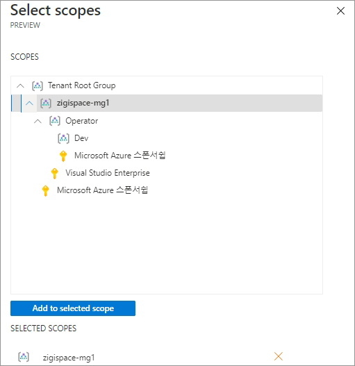 현재 지정한 Scope는 'zigispace-mg1'이라는 Management Group을 선택했습니다.
