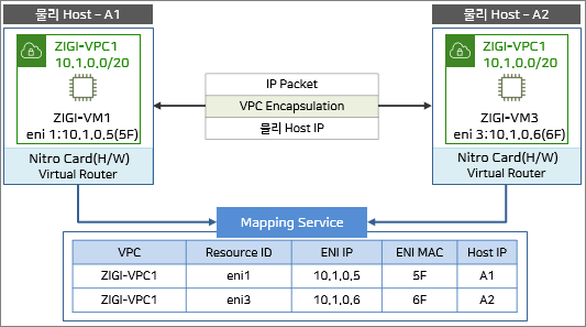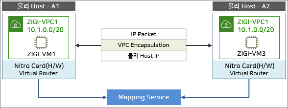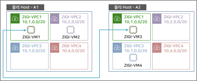 그럼 서로 물리적으로 서로 다른 Host에 위치한 ZIGI-VPC1의 ZIGI-VM1과 ZIGI-VM3은 어떻게 통신이 가능할까요?