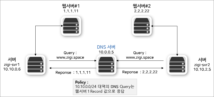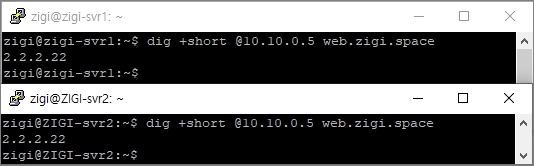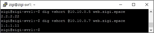현재 상태에서는 zigi-svr1(10.10.0.6)과 zigi-svr2(10.10.2.5) 모두 web.zigi.space에 대해서 2.2.2.22로 응답 받는 것을 확인 할 수 있습니다.