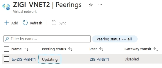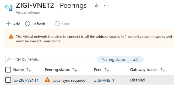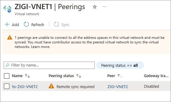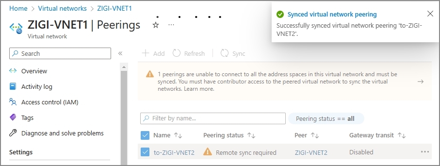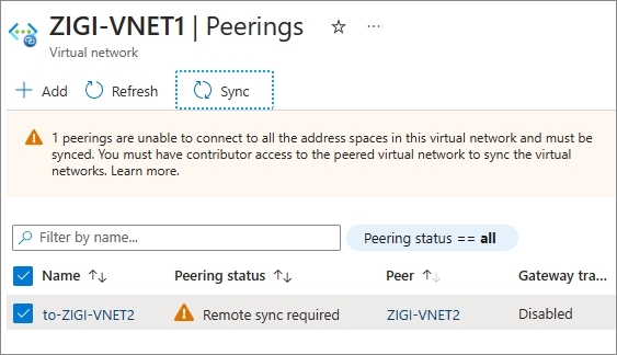 ZIGI-VNet1과 ZIGI-VNet2의 Peering status가 모두 Sync가 필요하다고 뜹니다.