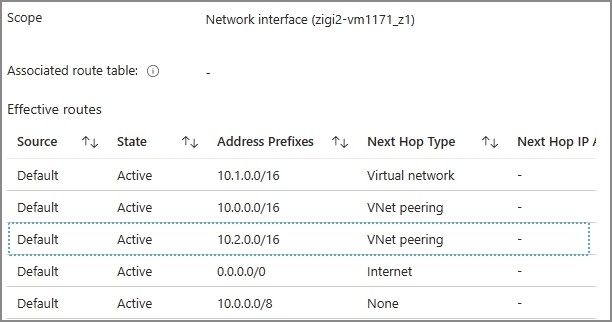 ZIGI-VNet2에 있는 VM에서 유효 경로를 확인해 보면,
