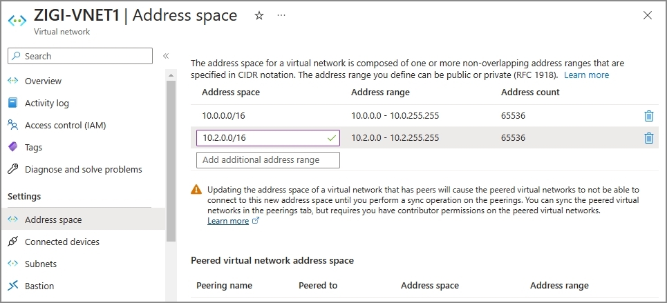 이제 ZIGI-VNet1에 10.2.0.0/16 이라는 Address Space를 추가합니다.