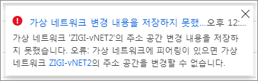 실제 Peering된 상태에서 Address Space를 변경하려는 경우에는 아래와 같은 오류가 발생했습니다.