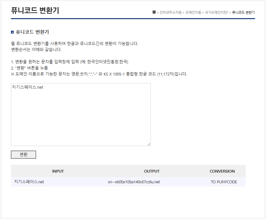 퓨니코드로 변환된 문자열은 접두어 xn--’이 붙습니다. 예를 들어 “지기스페이스.net”을 퓨니코드로 변환하면 ‘xn.ok0bxl0bal40c67cc6u.net’입니다.