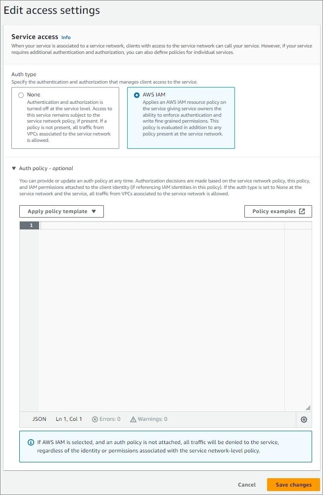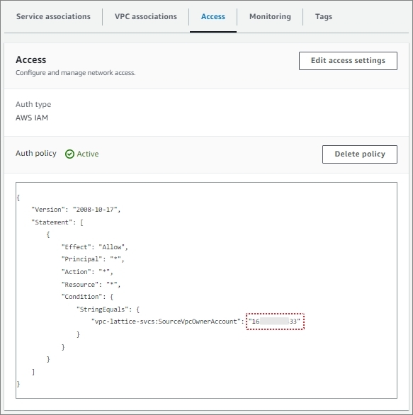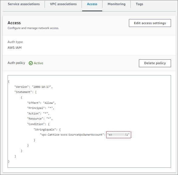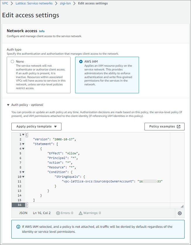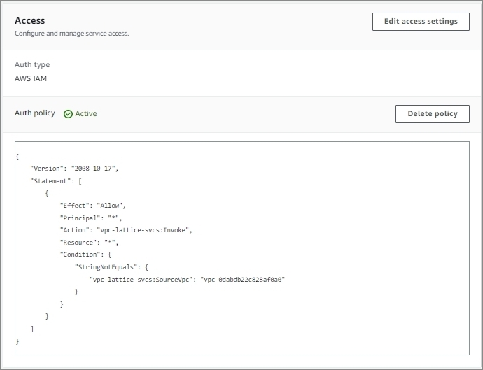 이제 특정 VPC에서만 VPC Lattice Service에 접근하도록 'zigi2-ls2'에 Access 정책을 설정해 보겠습니다.