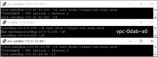 10.0.0.235라는 IP를 가진 가운데 Instance가 VPC Lattice Service의 Access 정책에 설정된 VPC에 속한 Instance입니다. 그 VPC를 제외하고 나머지 VPC의 서비스 요청한 허용했기 때문에 10.0.0.235 Instance만 zigi2-ls2로 접근이 불가하고, 나머지 서비스는 정상적으로 서비스에 접근 한 것을 볼 수 있습니다.