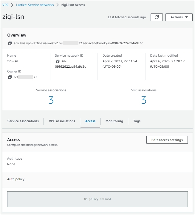 기존에 만든 VPC Lattice Service인 'zigi2-ls2'에는 별도의 Access 정책을 설정하지 않았기 때문에,