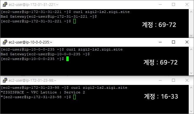 앞선 테스트와 달리, 172.31.31.221, 10.0.0.235 의 Instance에서만 VPC Lattice Service 호출이 성공하고, 기존에 성공하였던 '16-33' 계정의 Instance인 172.31.23.93 Instance는 서비스 호출이 실패한 것을 볼 수 있습니다