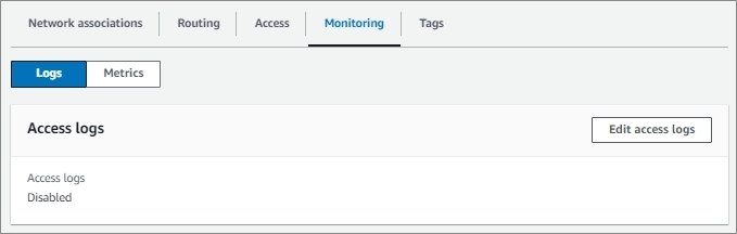 VPC Lattice Service Network를 만들 때, Access log에 대한 설정을 별도로 하지 않았다면 다음과 같이 'Disabled' 상태로 Log를 남기지 않습니다. 이제 Log 설정을 위해서 'Edit access logs' 버튼을 클릭합니다.