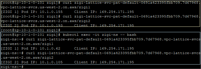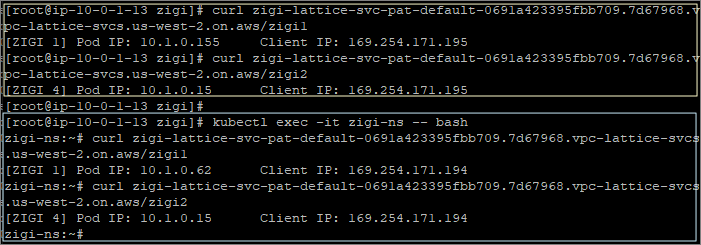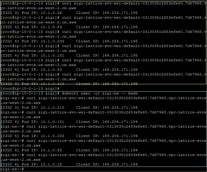 마찬가지로 ZIGI-VPC1의 Instance와 EKS Cluster Pod에서 기존에 Target에 Weight가 적용된 Lattice Service의 호출이 정상적으로 되는 것을 볼 수 있습니다.