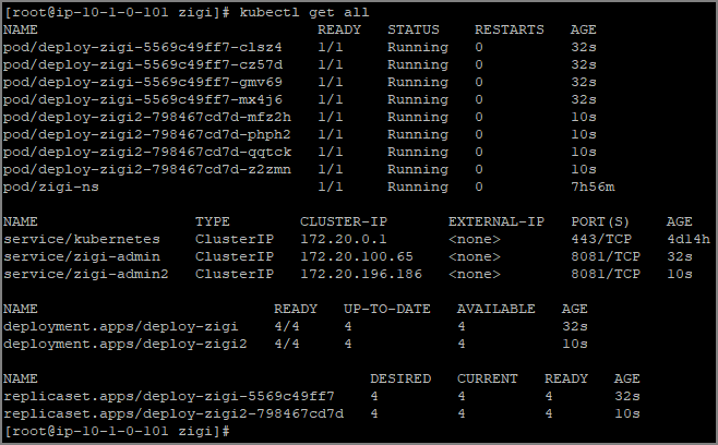 zigi-admin, zigi-admin2라는 이름의 2개의 Serivce가 각각 4개의 Pod를 가지고 배포 되어 있습니다.