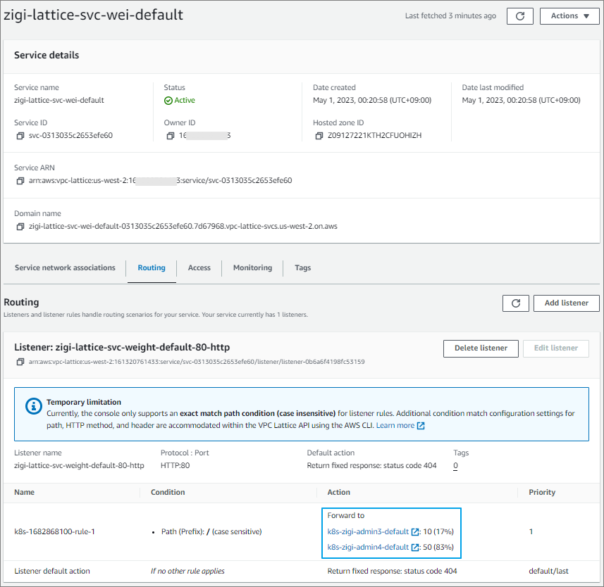 Console에서 보면, 다음과 같이 Lattice Service에서 Target에 대한 Forward 동작 시 Weight가 설정된 것을 볼 수 있습니다.