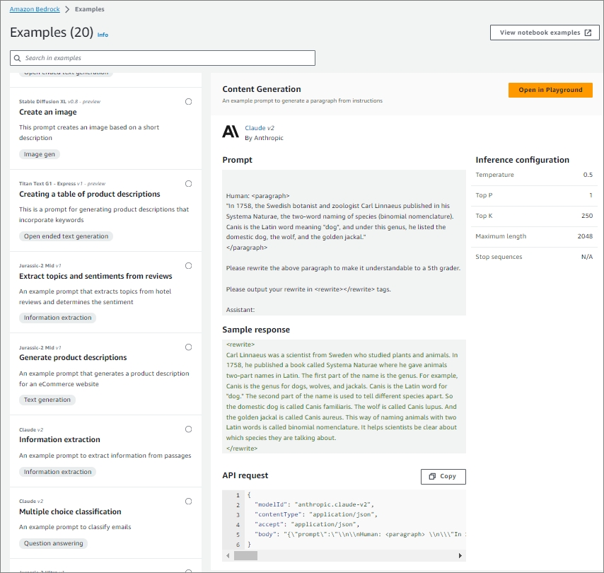 Amazon Bedrock에서는 Bedrock을 통해서 사용 가능한 예시를 Prompt 내용이나, Inference Configuration과 함께 예시 겨과를 제공합니다. 또한, 해당 예시에 대한 API request 값도 함께 제공하여 해당 예시 내용을 수정하여 사용 할 수 있습니다.