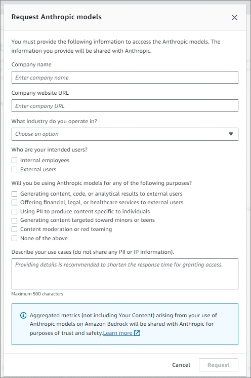 Request를 클릭하면 다음과 같은 'Request Anthropic models' 창이 뜨는 데, 아래 내용을 모두 기입하고 사용 요청을 하면, Model의 Access status가 'Not Requested'에서 다른 모델처럼 'Available'로 변경됩니다.