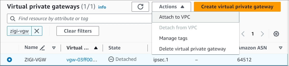 방금 생성한 ZIGI-VGW를 VPC에 Attach 합니다.