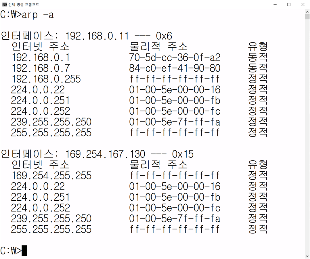 ARP 프로토콜을 이용해 IP 주소와 맥 주소를 매핑하면 “유형” 필드에 “동적”으로 표기됩니다.